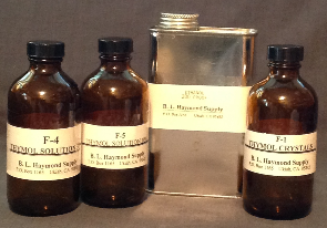 THYMOL SOLUTION 50%................4 oz A concentrated solution which, when diluted with 4 parts 200-proof Ethanol to 1 part Thymol Solution, forms an effective fungicide for stretcher bars, frames, and the verso of oil paintings. It is also recommended as a preservative for starch and wheat adhesives. |